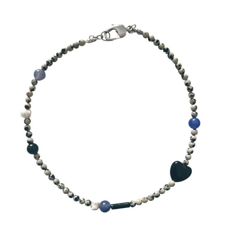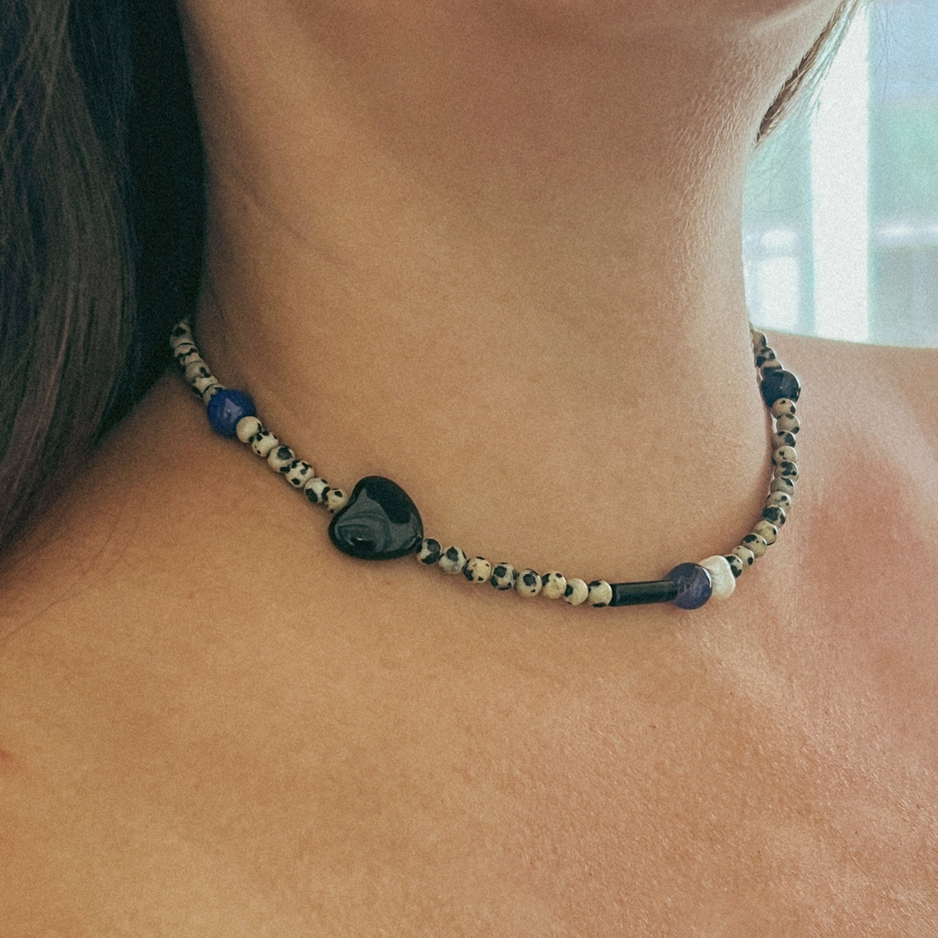 Add some fun to your jewelry collection with our 02 / Essence necklace! This choker style necklace features unique dalmatian jasper beads, blue agate, and freshwater pearls, all accented with silver finishings. Simple yet playful, this design is perfect.