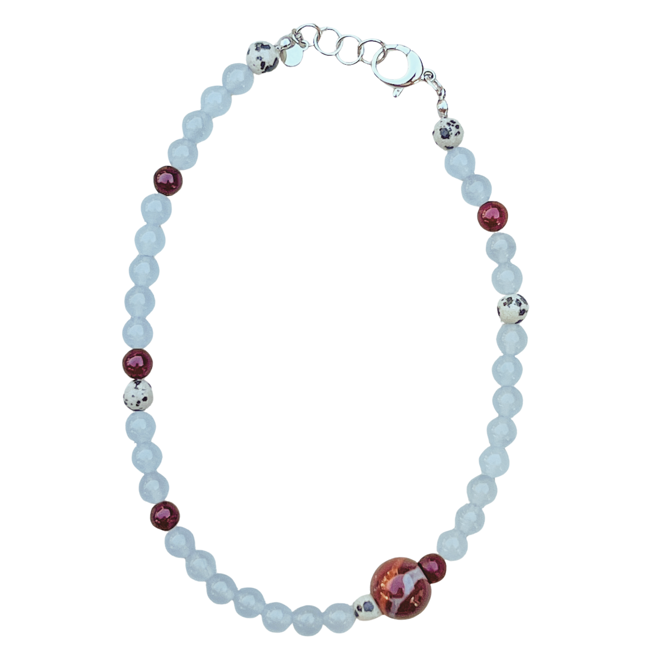 This one-of-a-kind handmade necklace features soft light blue agate beads with pops of maroon agate and jasper, all anchored by a stunning marbled gemstone centerpiece. Silver finishings complete the look.