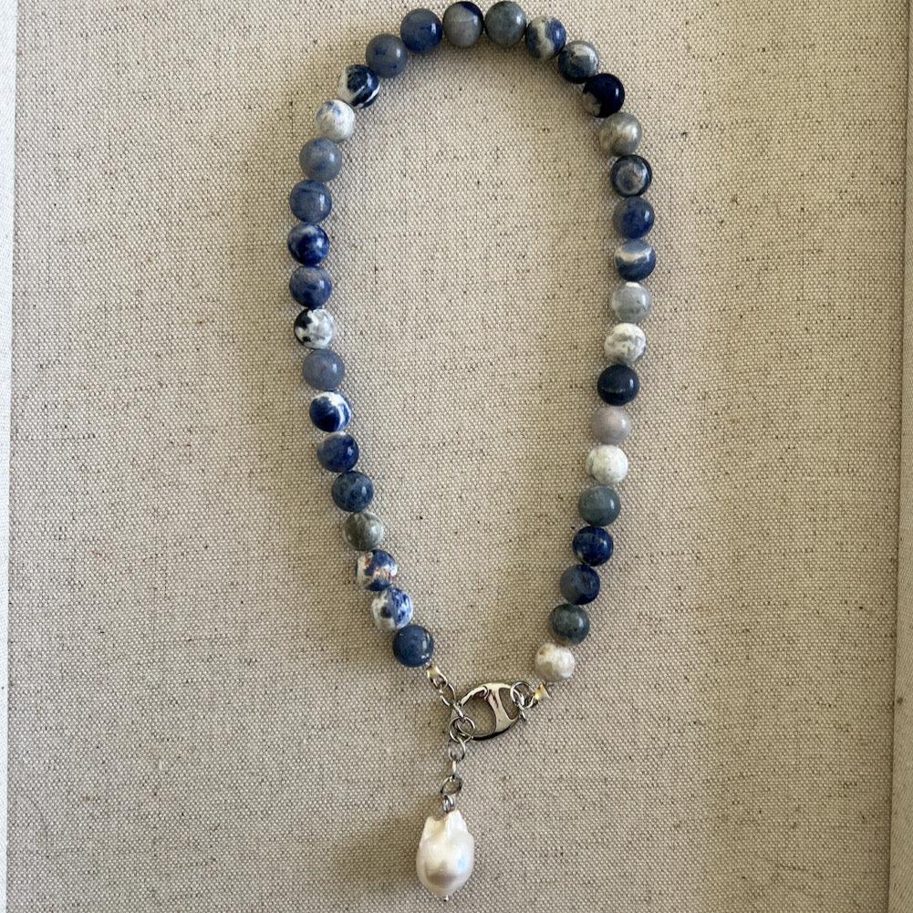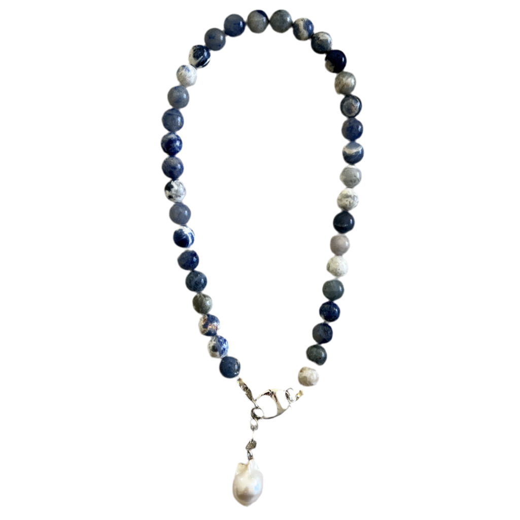 Embrace the jungle's energy with our 03 / Selva Negra necklace. Designed with blue sodalite gemstone beads and a large freshwater baroque pearl pendant. The silver finishings add a touch of finesse. Wear it with the pearl detail in the front or back, symbolizing the refreshing rain drops of the jungle.