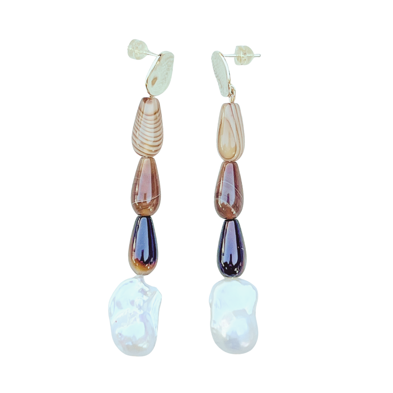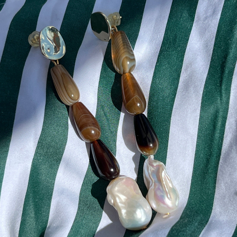 Playful drop earrings with spiral-patterned brown agate teardrops and shimmering iridescent freshwater pearls. Gold posts for comfortable, all-day wear.