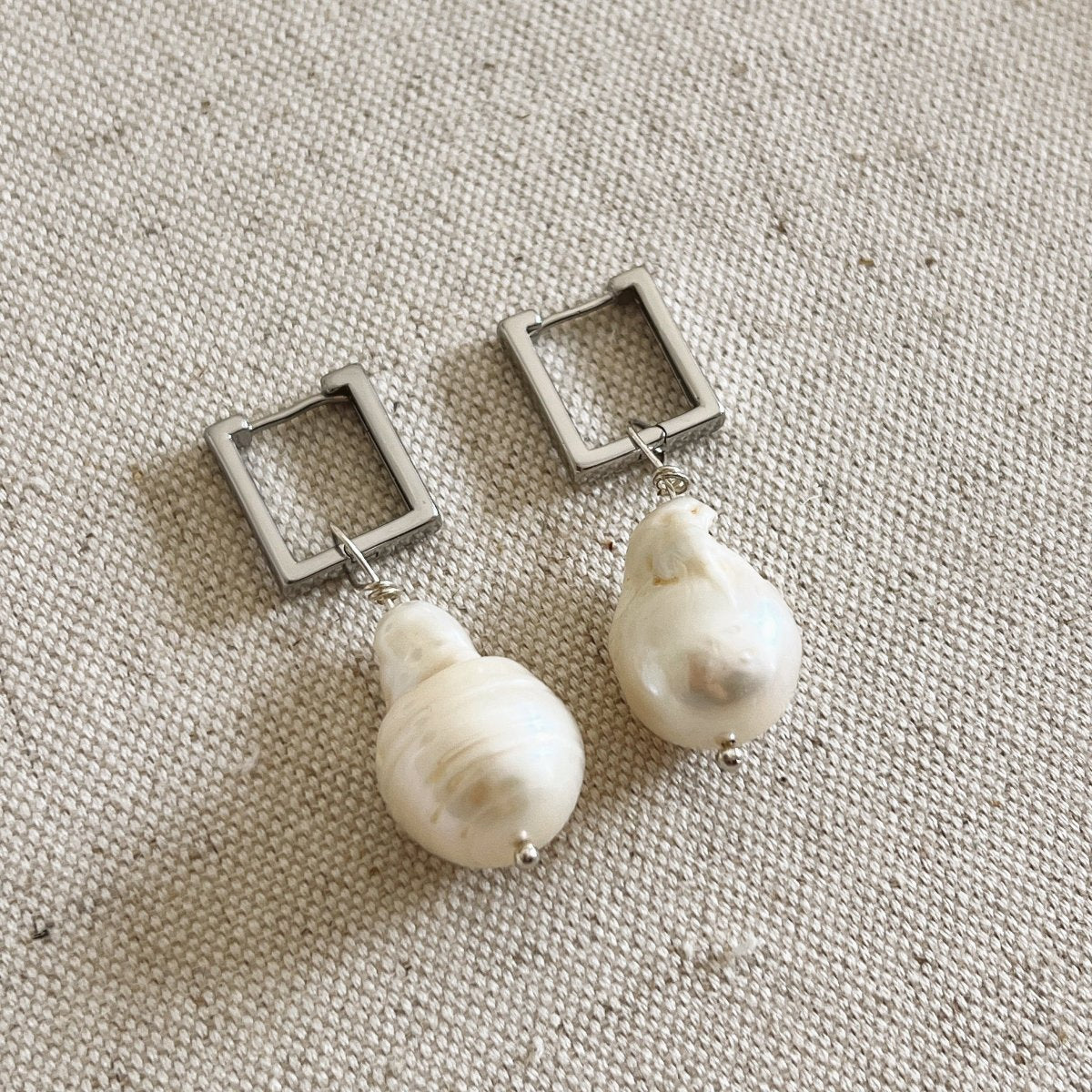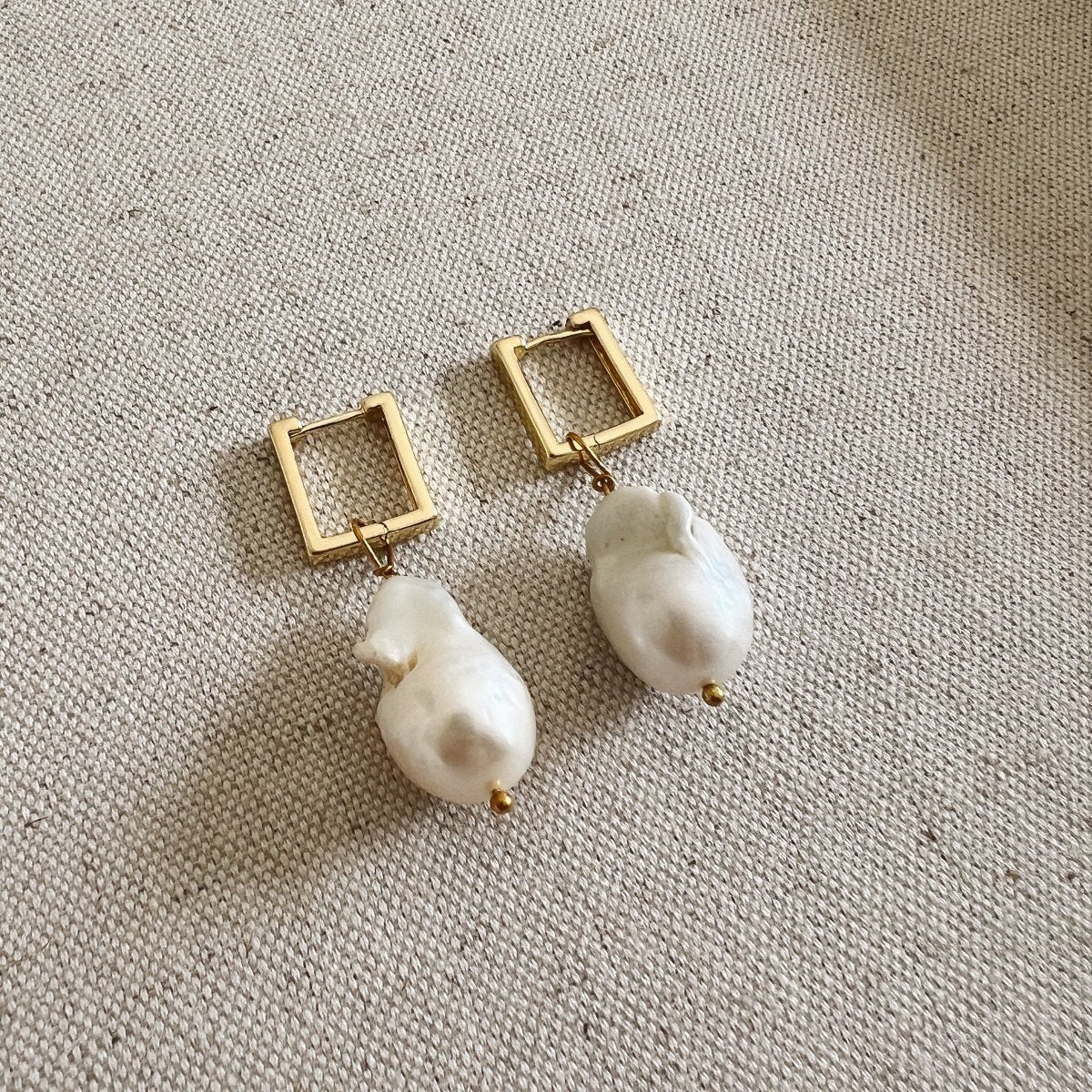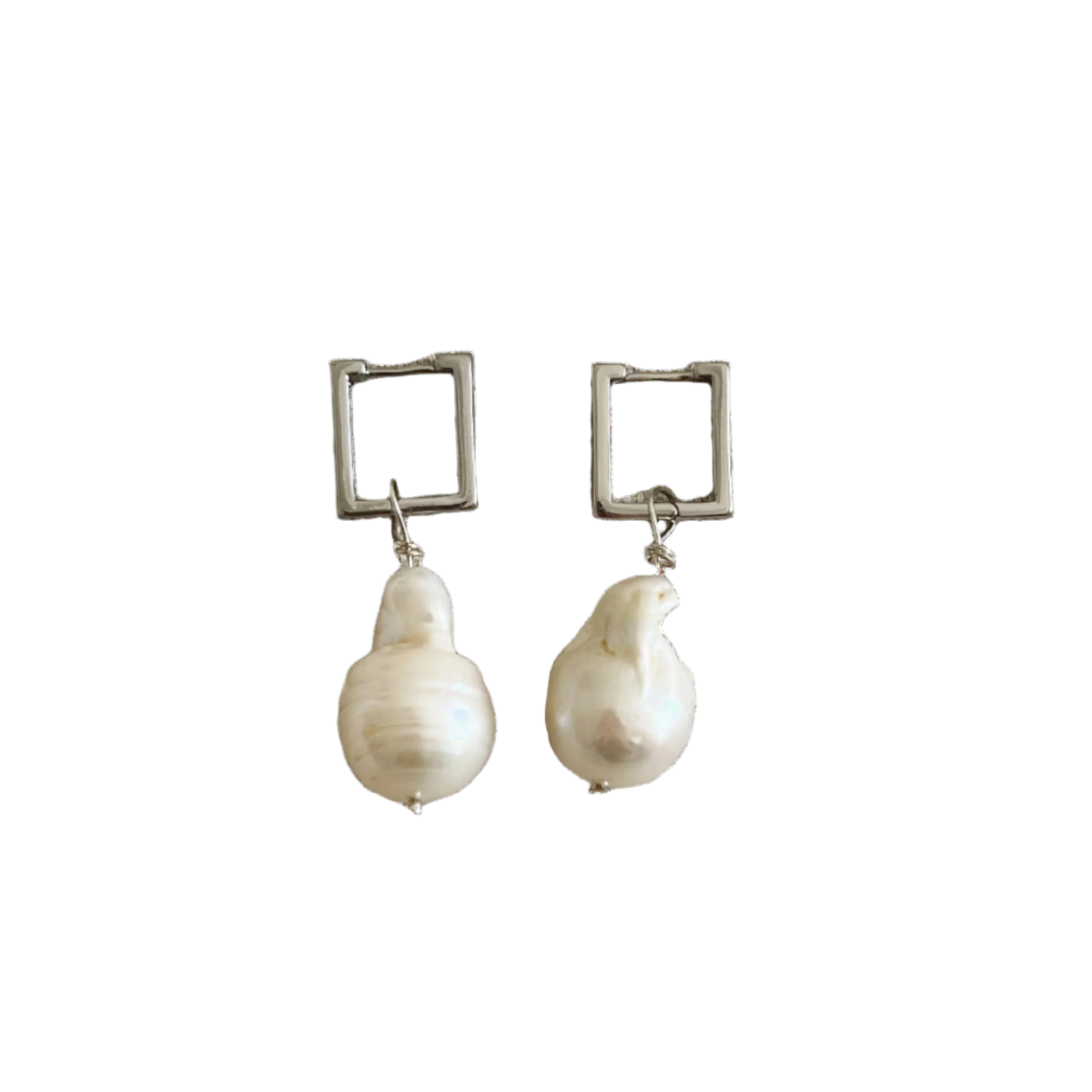 These Selva Negra earrings are a square shape with large freshwater baroque pearls that reflect iridescent colors, inspired by the darkness of the tropical jungle.