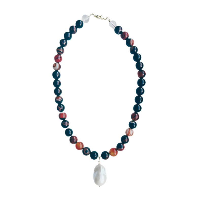 Add a touch of nature to your look with this earth toned beaded necklace featuring reddish brown agate beads and a large freshwater baroque pearl pendant. Finished with a gold lobster clasp.