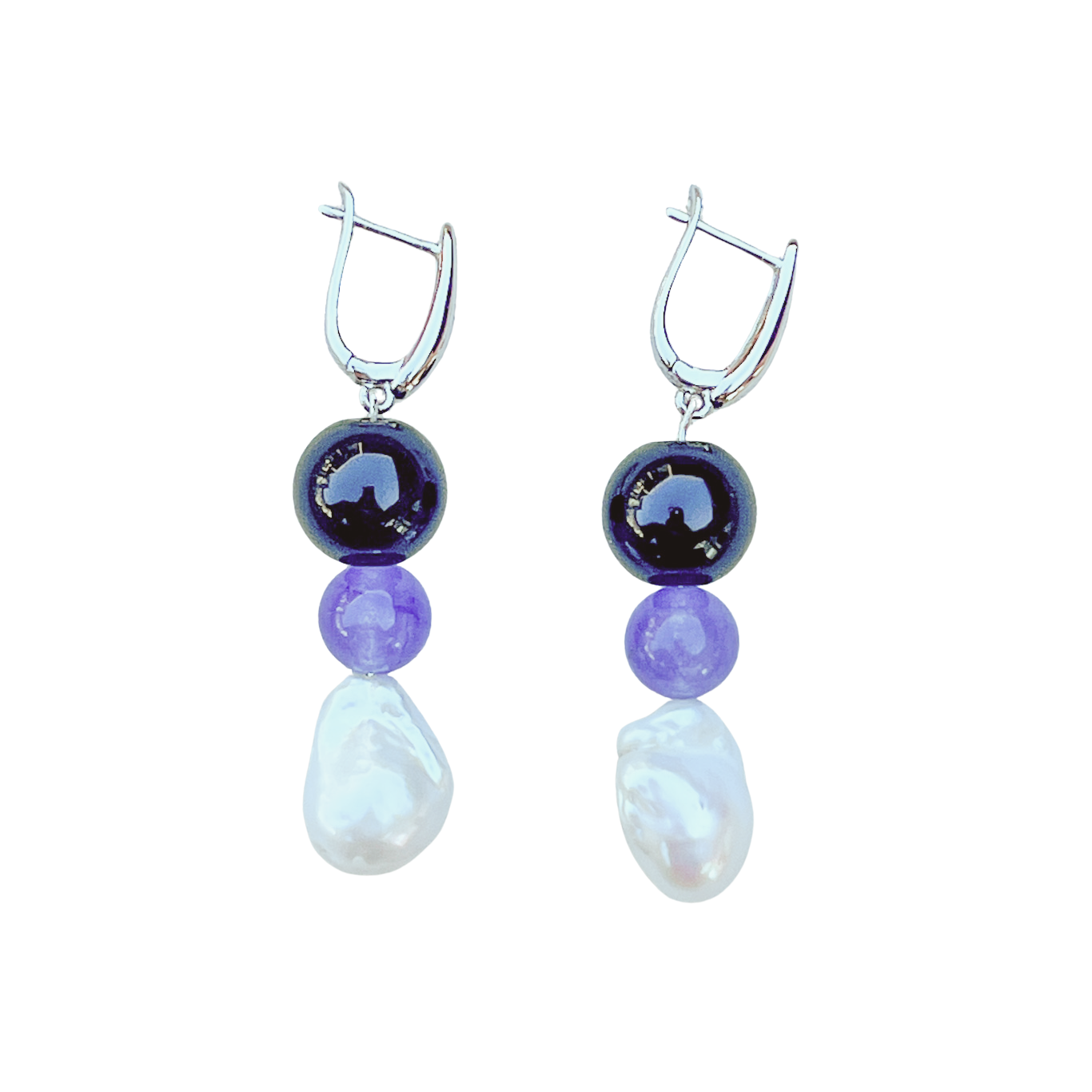 Playful dangle earrings with periwinkle blue glass beads, freshwater pearl drops, and a silver leverback clasp. Simple, elegant, and ready for any look.