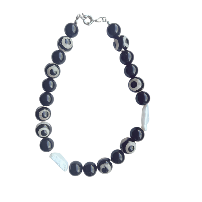 Make a statement with this chic and chunky necklace features large graphic painted agate beads, black glass beads, and 2 irregular shaped keshi pearls, all brought together with silver clasp finishings.