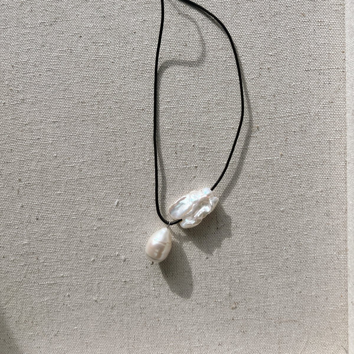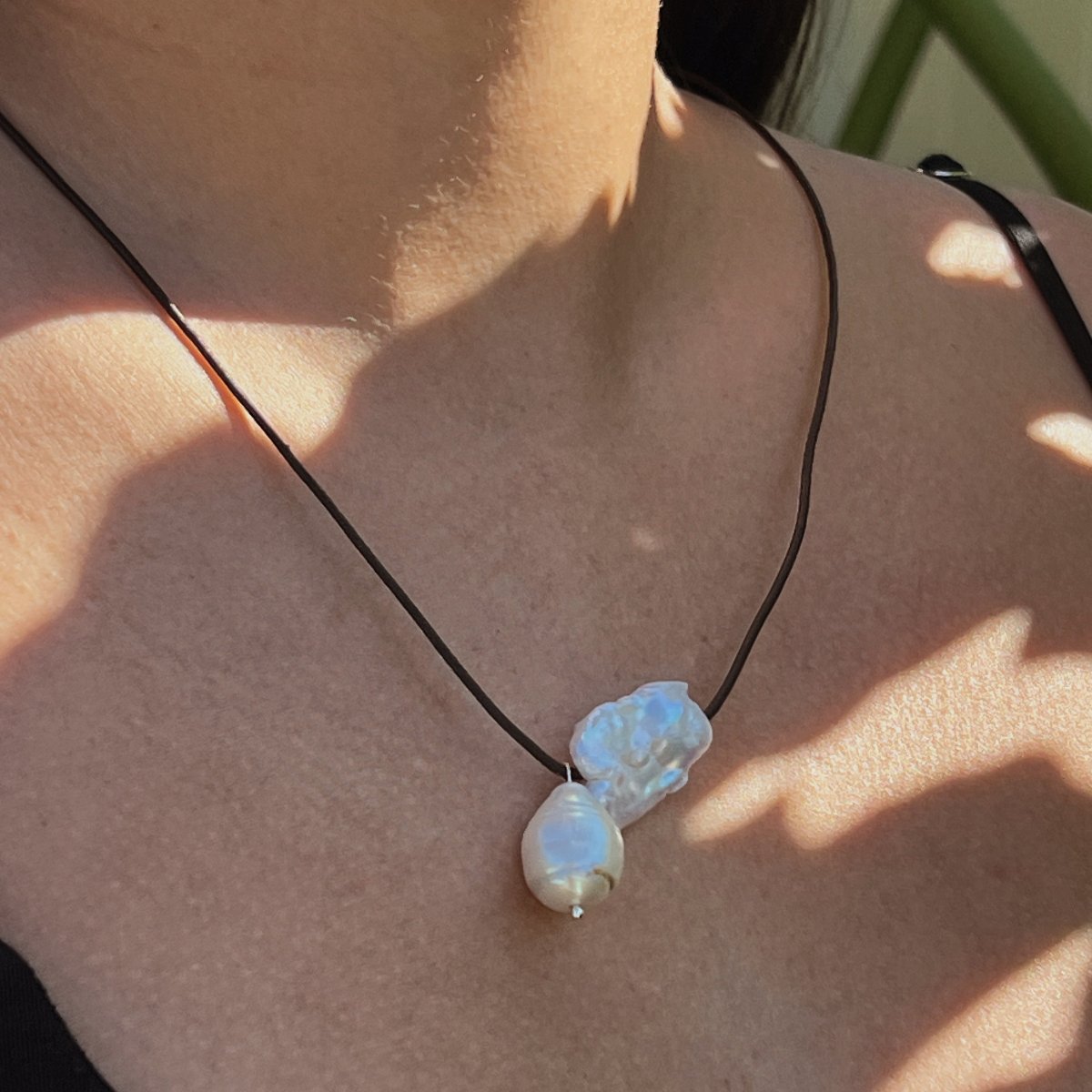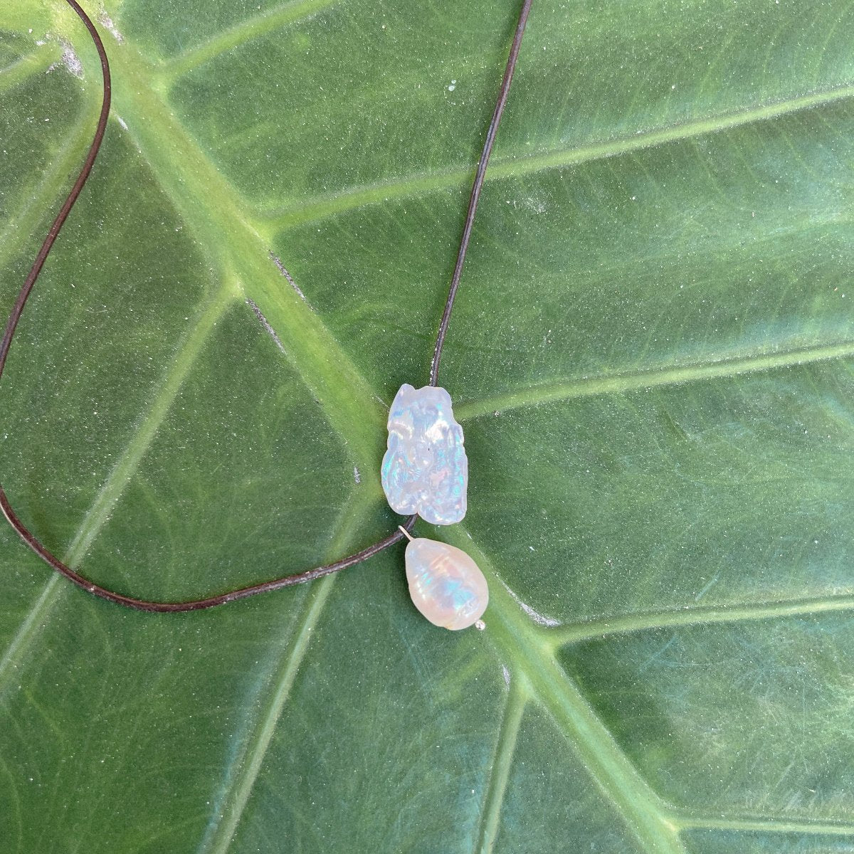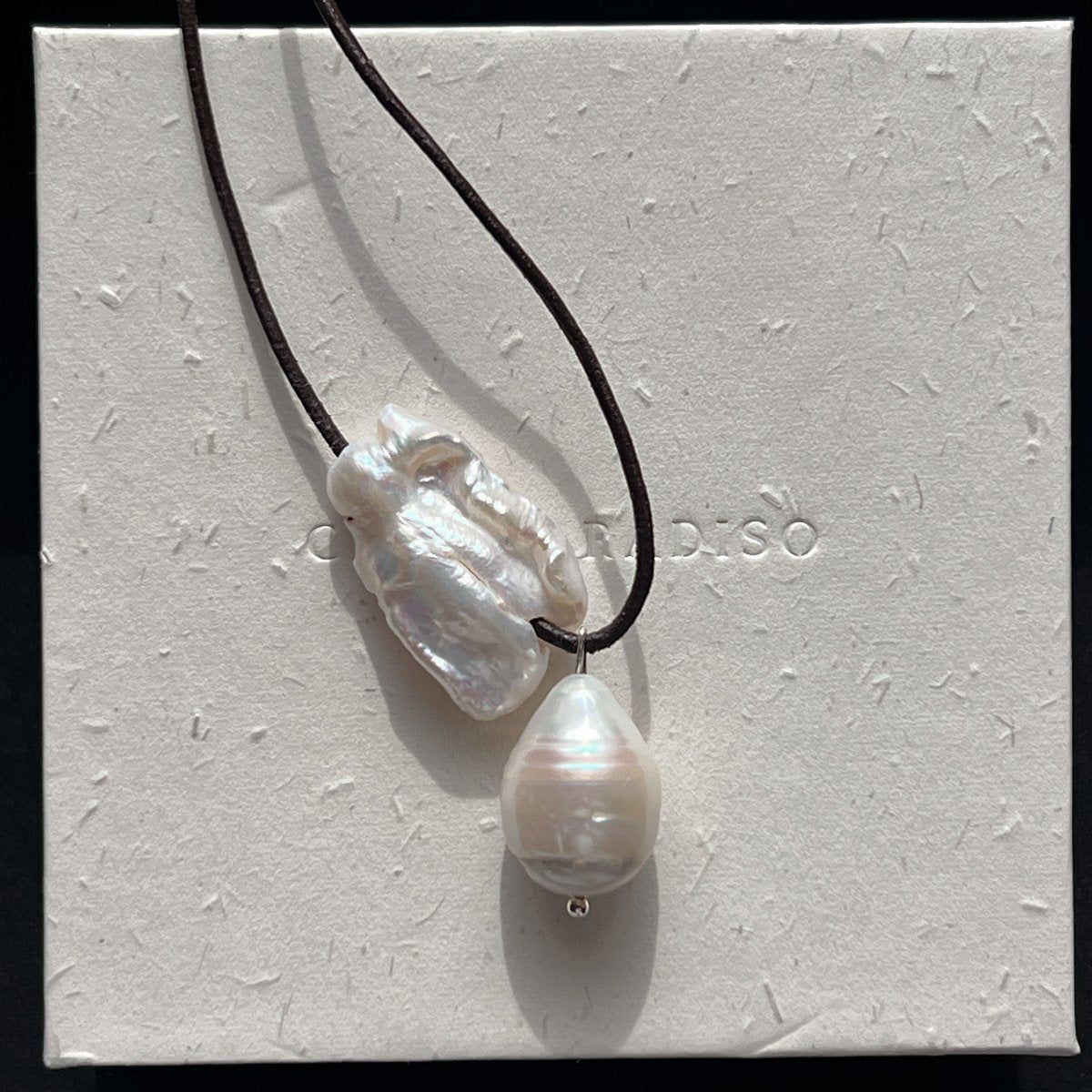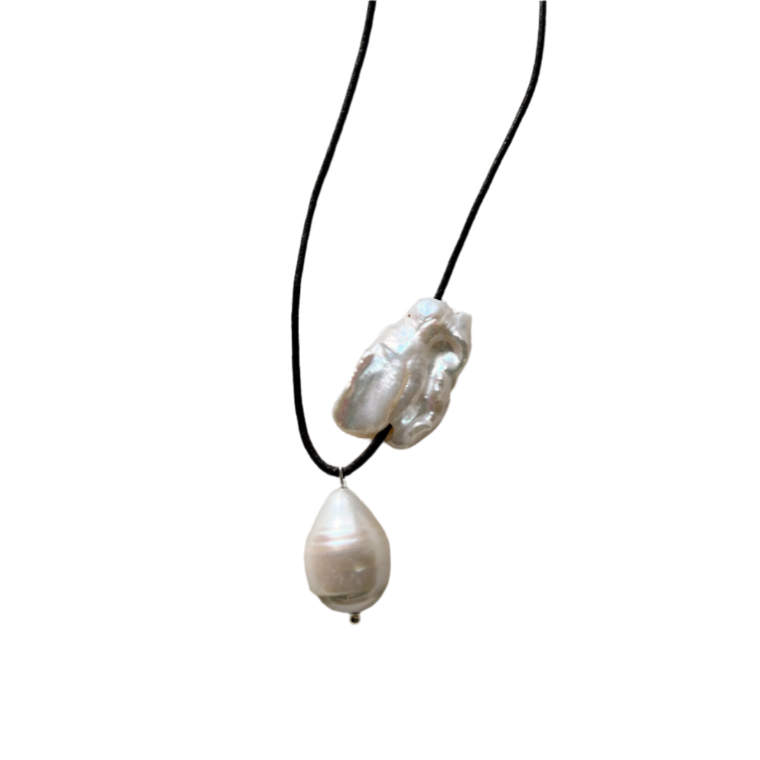 This necklace boasts a curiously simple design. The brown rounded leather cord adds a touch of natural sophistication, while the 2 freshwater pearls - a baroque drop shaped pearl and irregular square shaped pearl - provide a beautifully iridescent touch. Can be worn wrapped around neck.