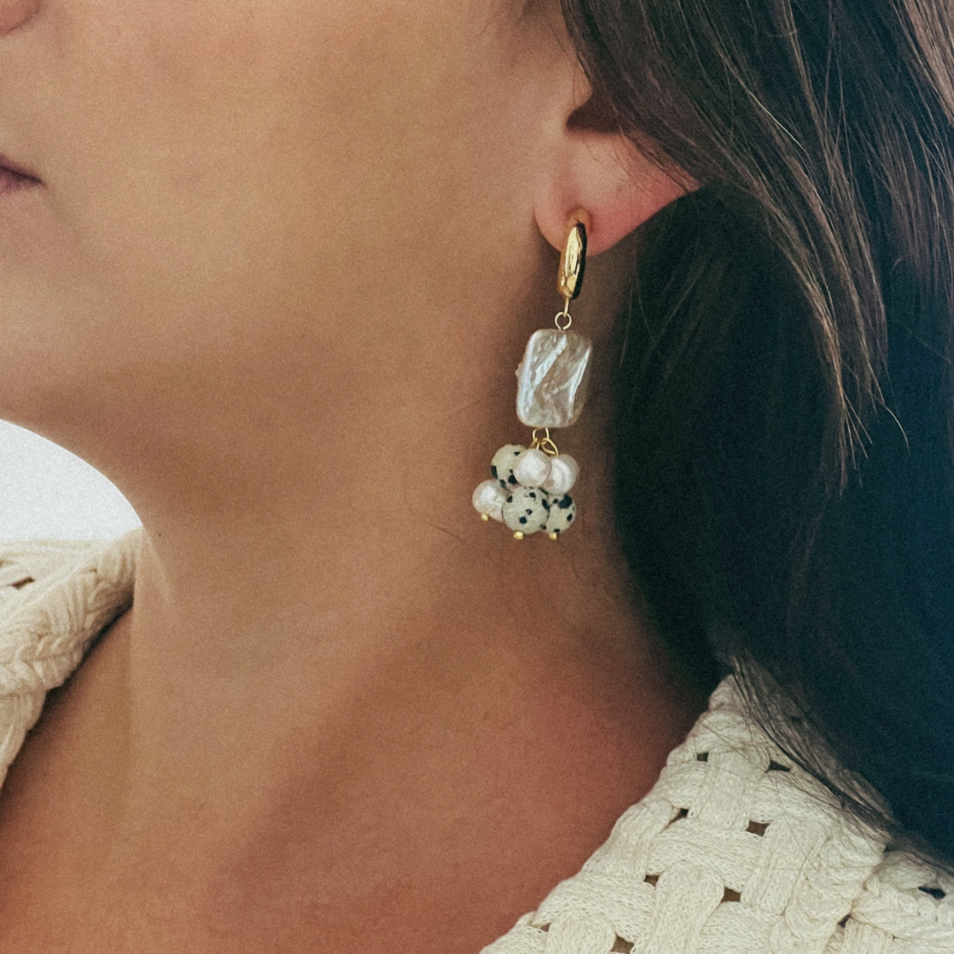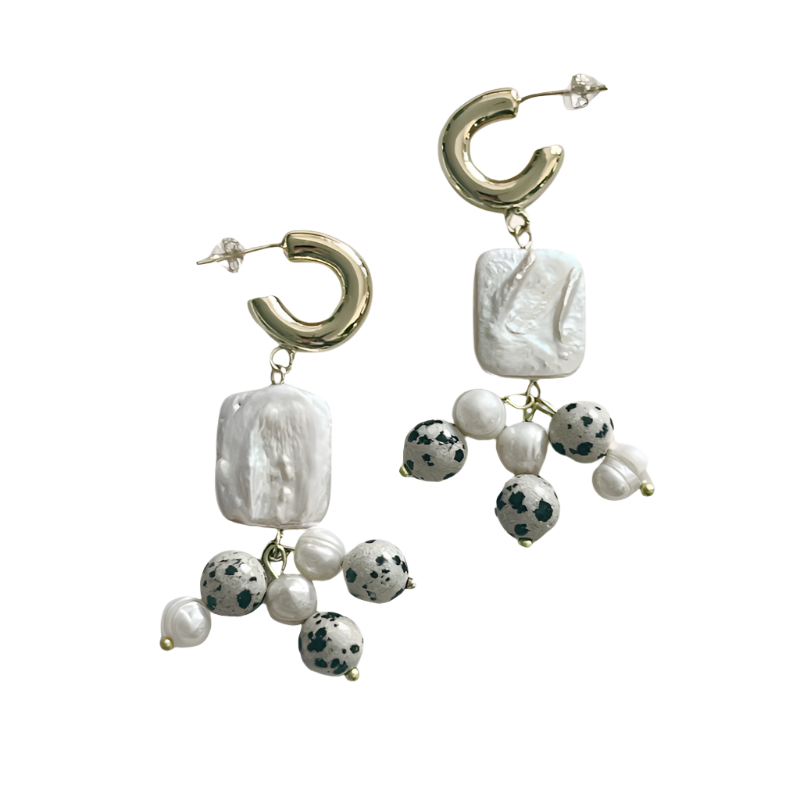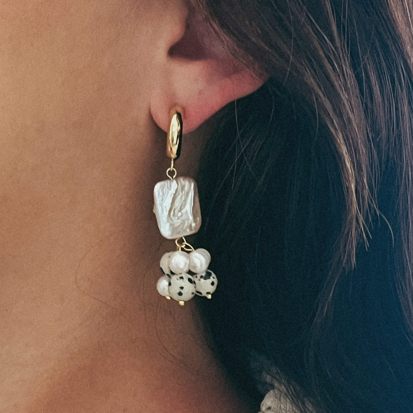 Put a new twist on traditional pearl earrings with these handmade gold huggie earrings featuring square freshwater pearls, jasper and pearl beads, for a playful and stylish look.