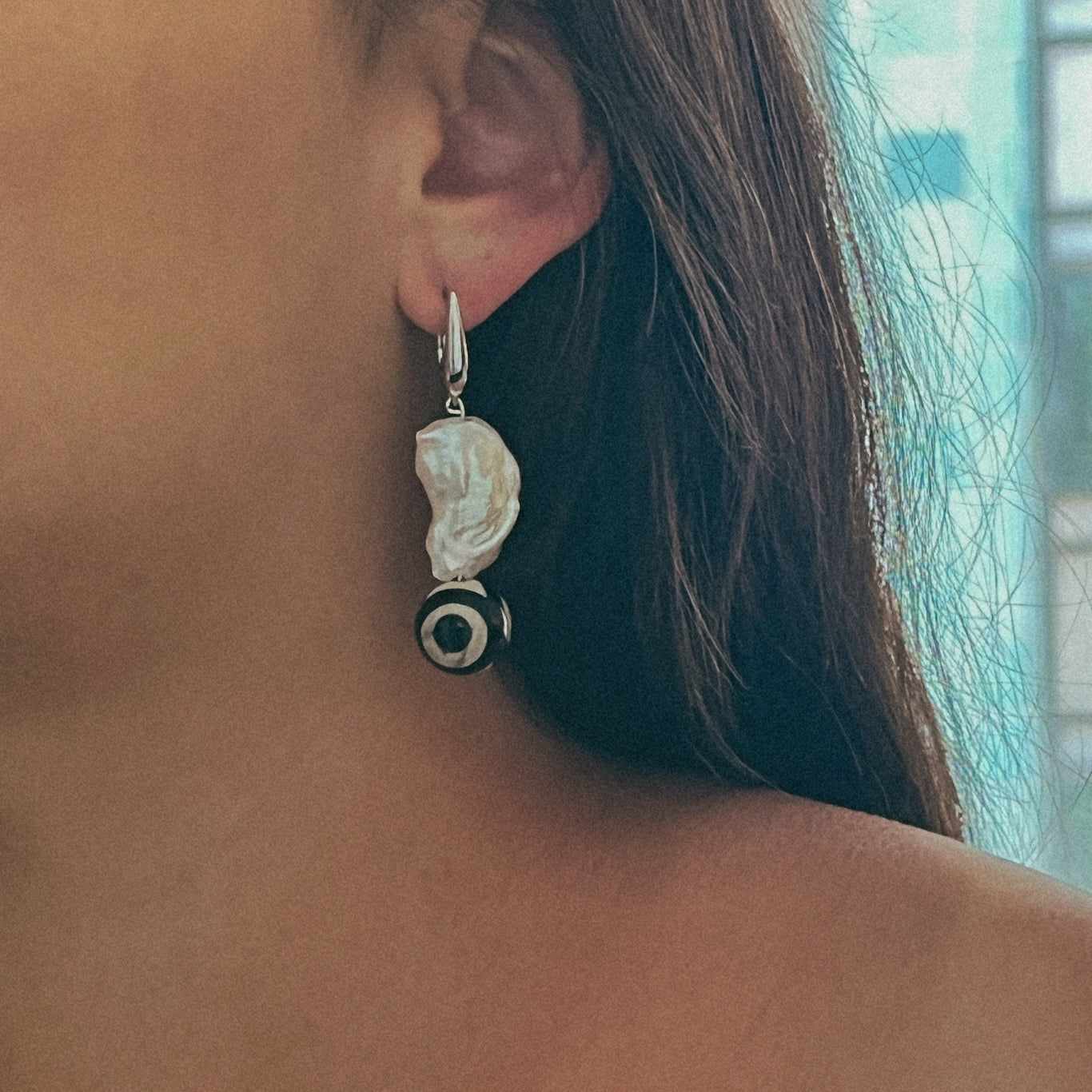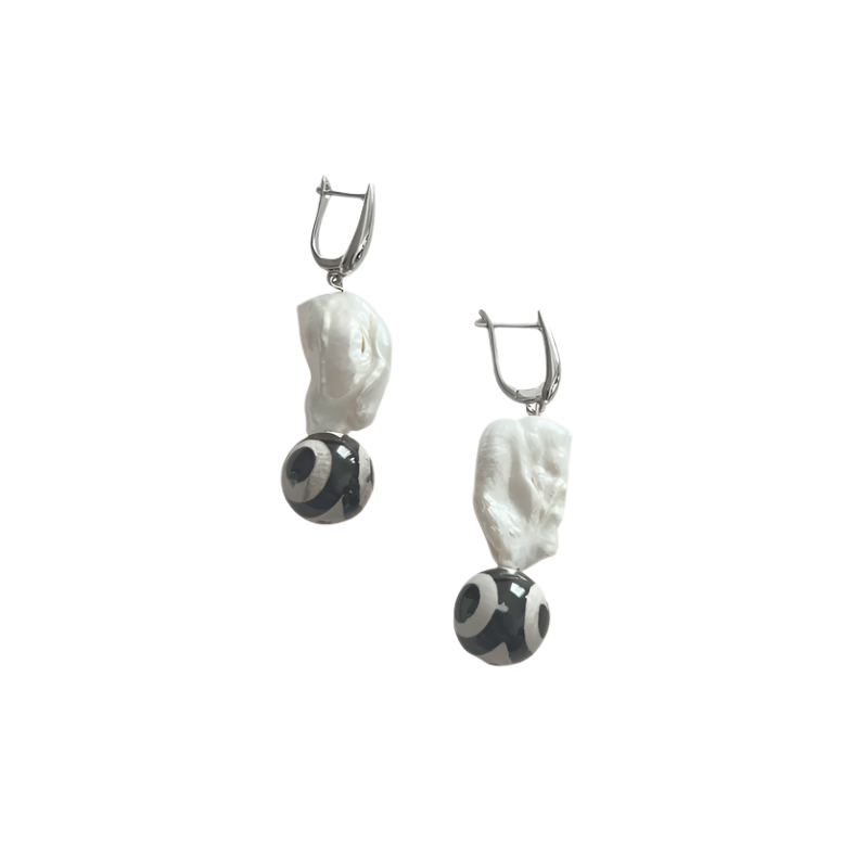 These playful dangling earrings feature two large Irregular shaped Keishi pearls, paired with a unique Agate painted graphic design bead at the bottom. Handmade with care and finished with silver clasp posts.