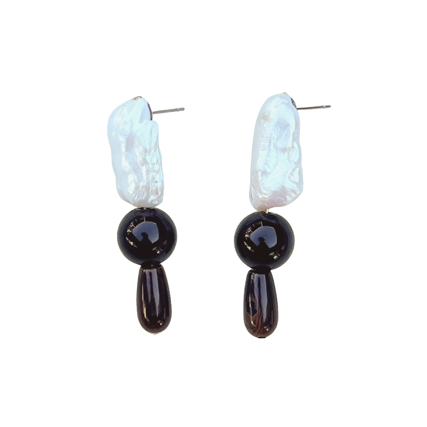 Refined drop earrings with large irregular Keshi pearls, a commanding black glass bead focal point, and rich brown agate teardrops on silver posts. Pure sophistication.