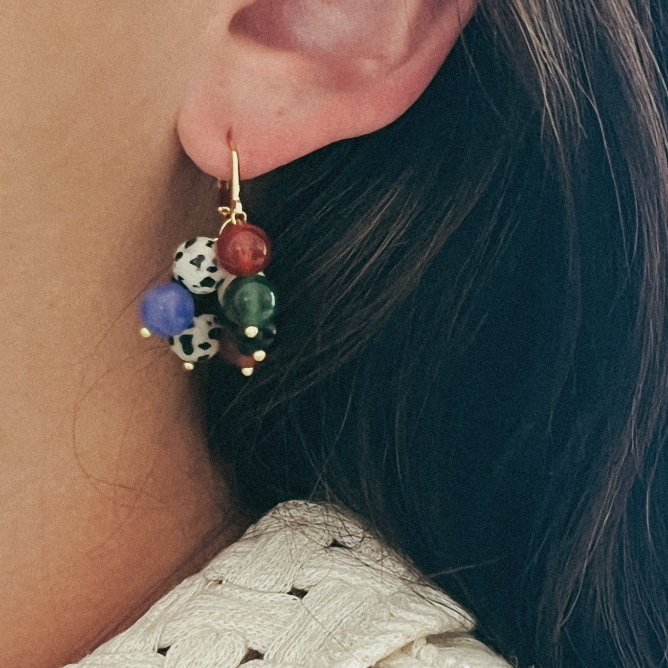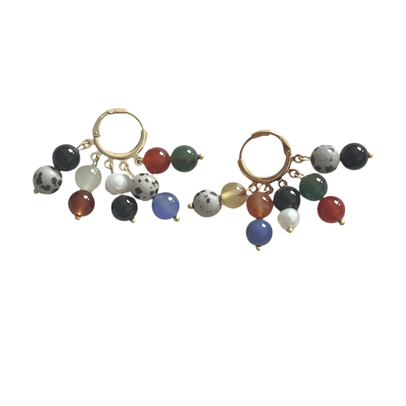 Add some playful flair to your look with 11 / Essence multi-strand huggie earrings. These unique earrings feature a mix of multi-colored agate beads, jasper beads, and freshwater pearls, all accented with a shiny gold finish. Handmade earrings!