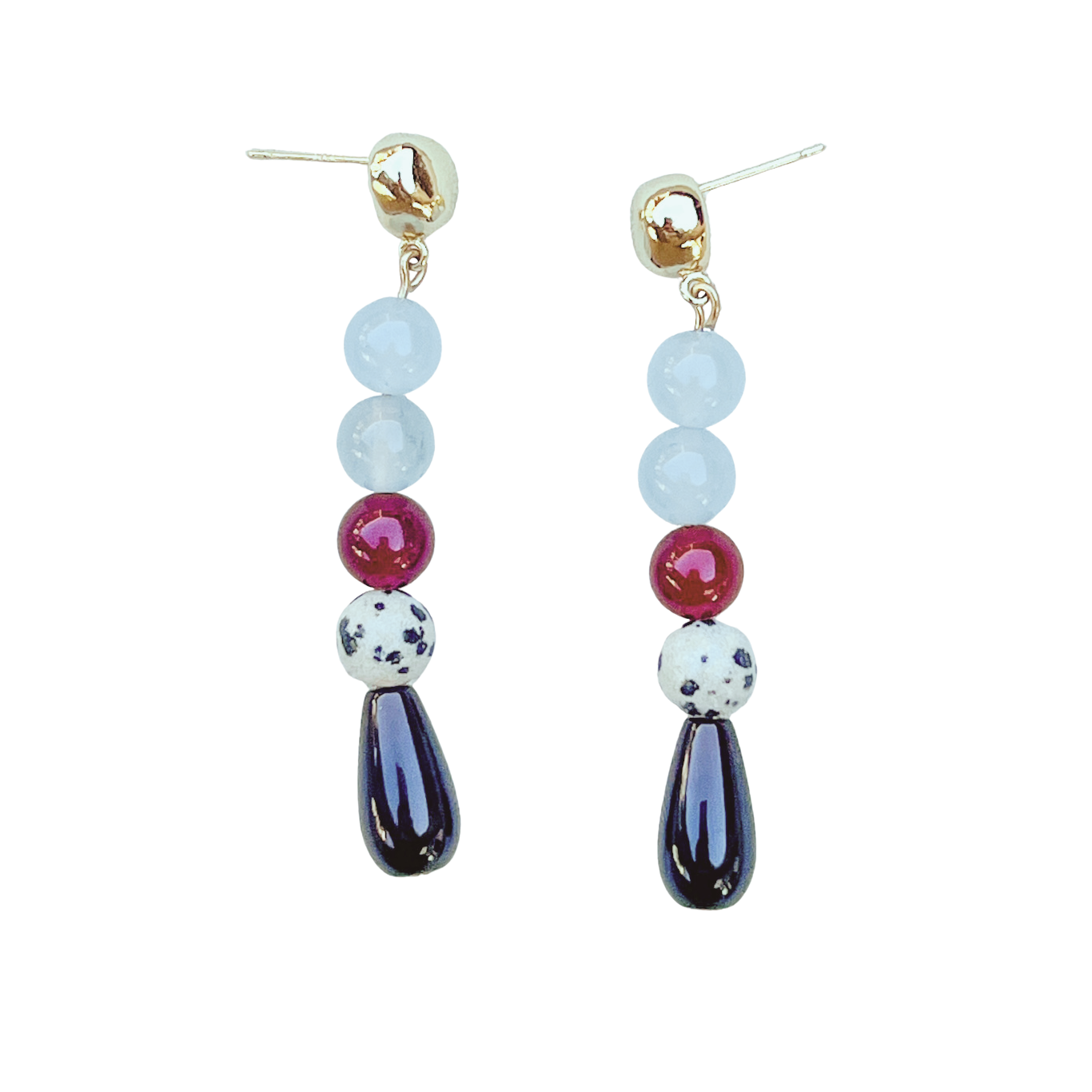 Playful dangle earrings featuring a vibrant mix of light blue and maroon agate beads with jasper and a rich brown agate teardrop, all set on warm gold posts. Funky for anyone who loves bold color combinations.