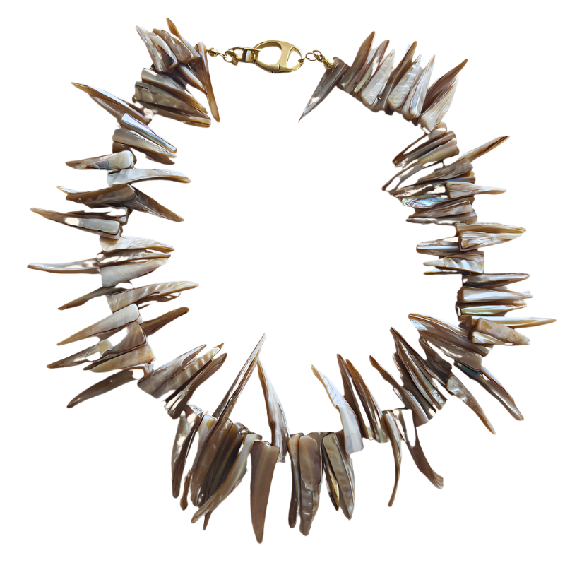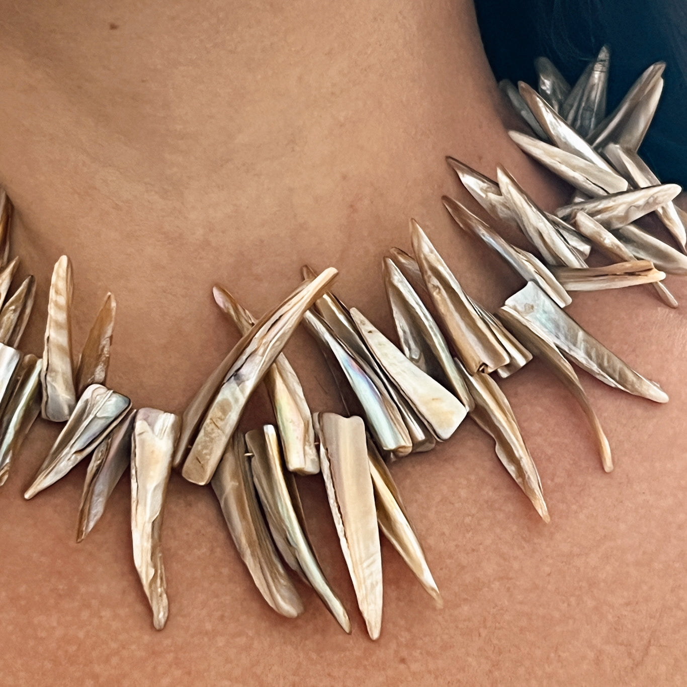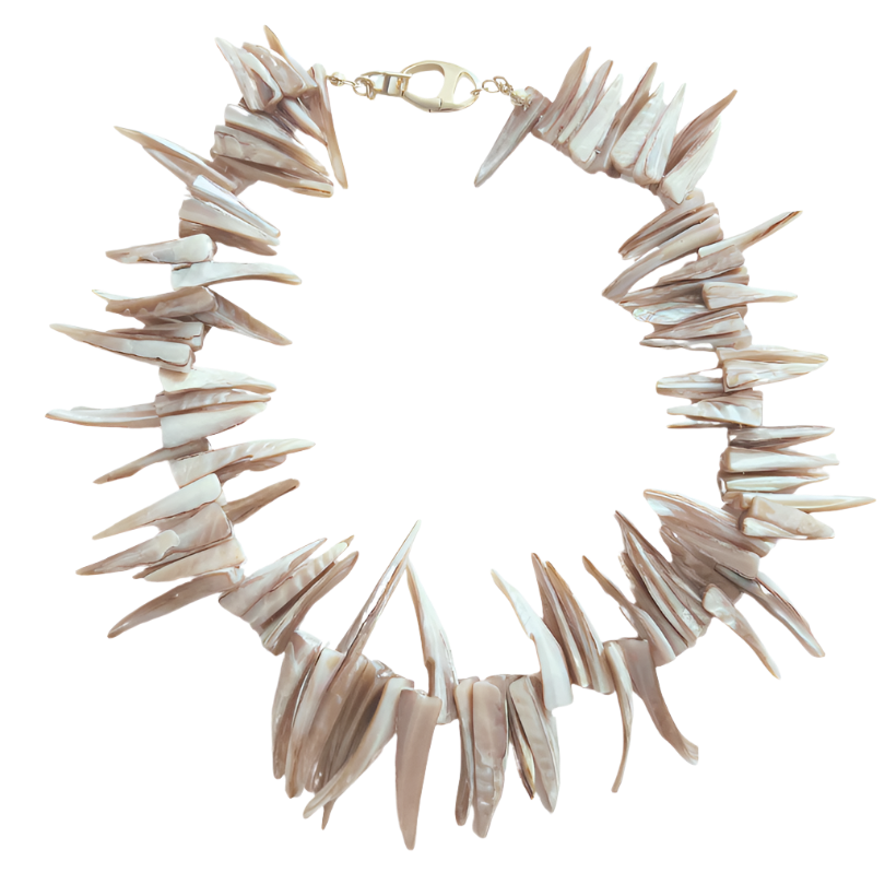 Introducing 13 / Essence, a handmade necklace featuring iridescent pearl shell beads with a jagged design intention. The luxurious gold clasp finishings add a touch of sophistication.