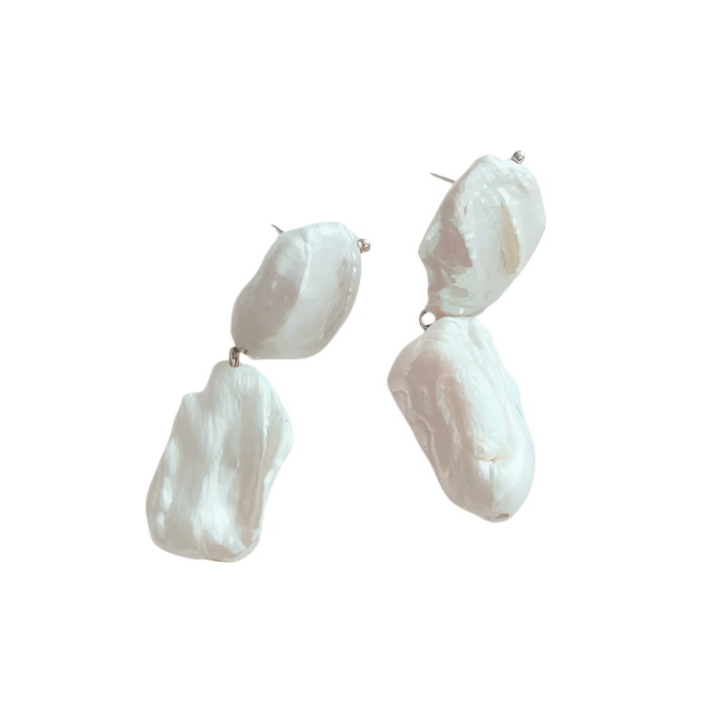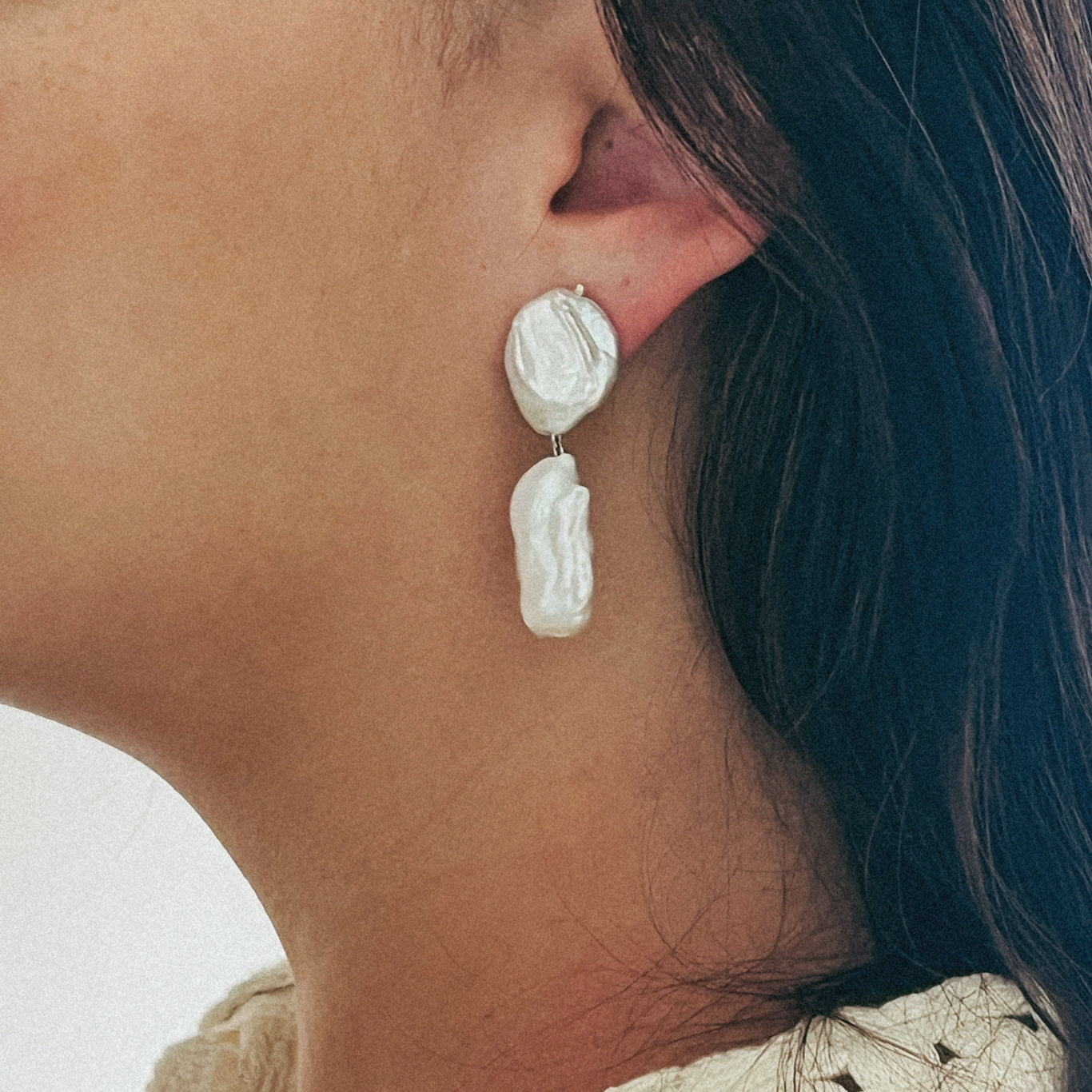 Slip into elegance with our 16 / ESSENCE dangle earrings. Adorned with large freshwater keshi pearls, these earrings are sophistication. Complete with sleek silver posts and finishings.