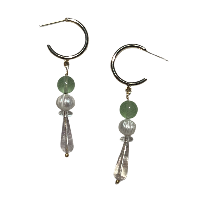 Arihi earrings combine hand-made gold accents with freshwater pearls, green quartz, and a clear rose quartz teardrop. Lightweight and gentle on sensitive ears, they capture the essence of drifting coral.
