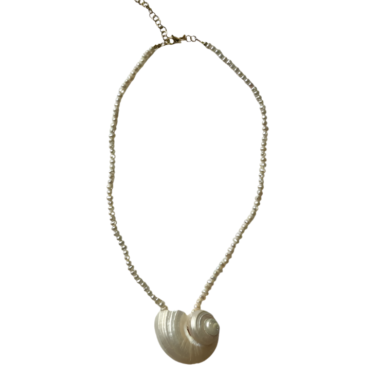Experience the allure of the Capri Charmed Necklace. Adorned with a stunning Turbo Shell Pendant and a delicate strand of freshwater micro pearls, this pearly necklace will transport you to the Mediterranean. This is a handcrafted piece, cherish it as a timeless reminder of your memories in Capri.
