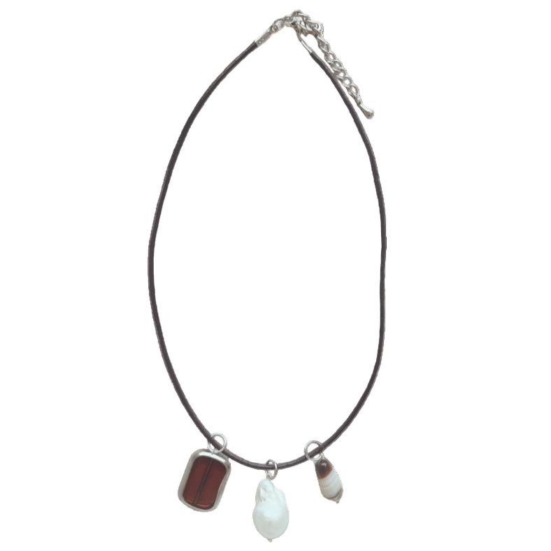 The Felix necklace offers a blend of natural materials and refined details. Suspended on a leatherette cord, its triple pendant design features a freshwater pearl, a polished square brown glass bead, and a teardrop-shaped semi-precious agate stone, all accented with rhodium finishings.
