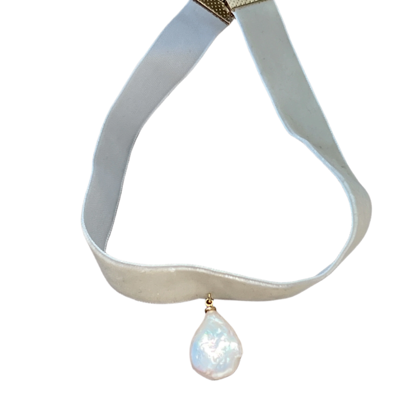 Channel retro beach vibes with our Kaimana necklace. Made of soft creamy colored velvet with a gold finish, it features a unique double pearl-infused teardrop pendant.