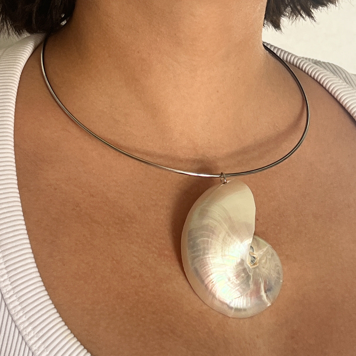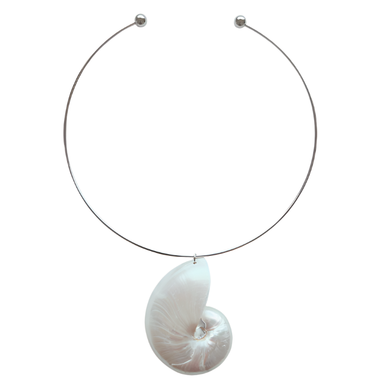 Sophistication defines the Lucia - a lustrous solid silver choker adorned with a delicate iridescent nautilus shell pendant. Its adjustable design offers versatile elegance for any ensemble.