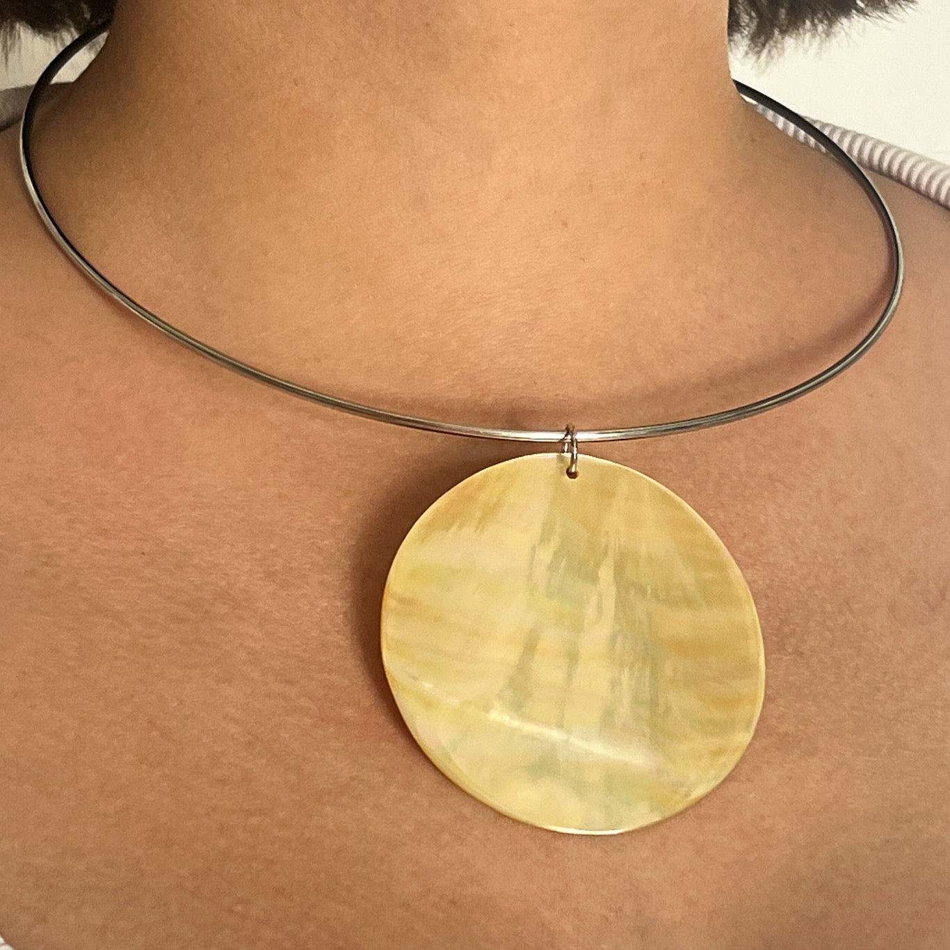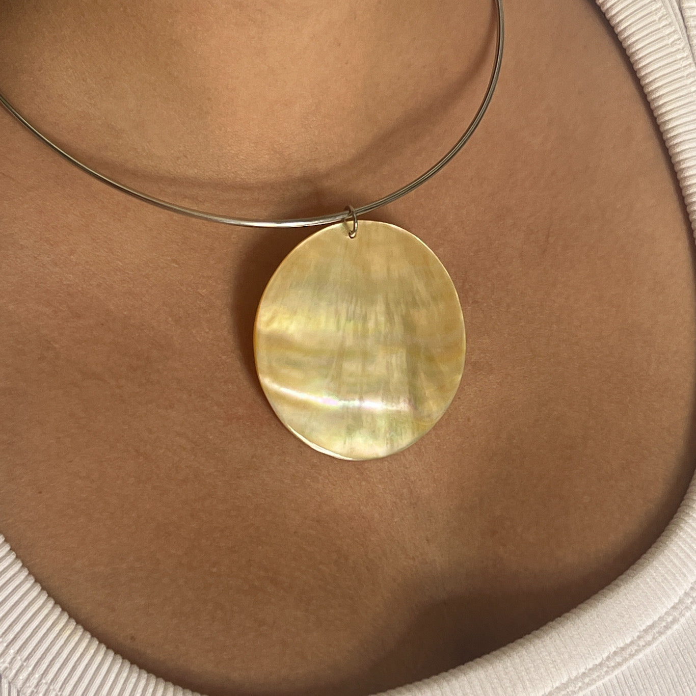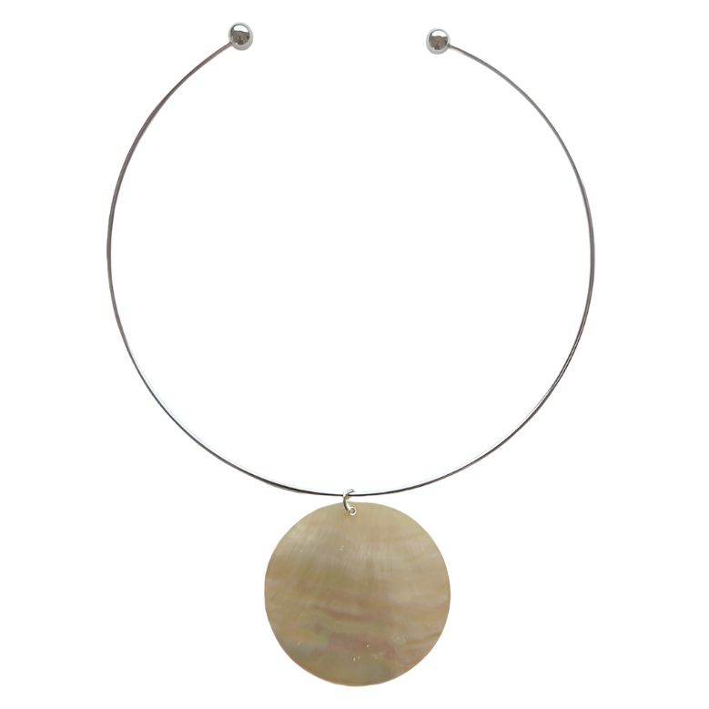 The Lucia Pearl choker exemplifies refined minimalism with its lustrous silver finish and exquisite iridescent mother-of-pearl accent. Its adjustable design ensures versatile elegance for any setting.