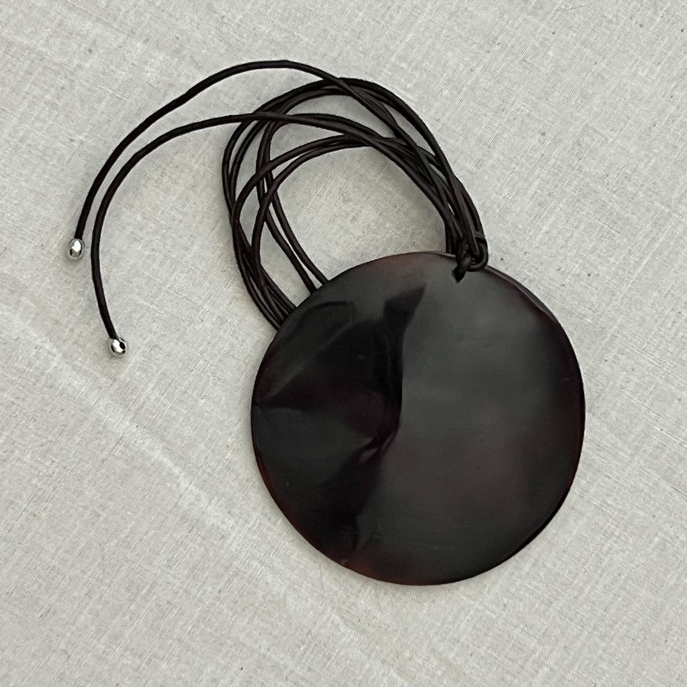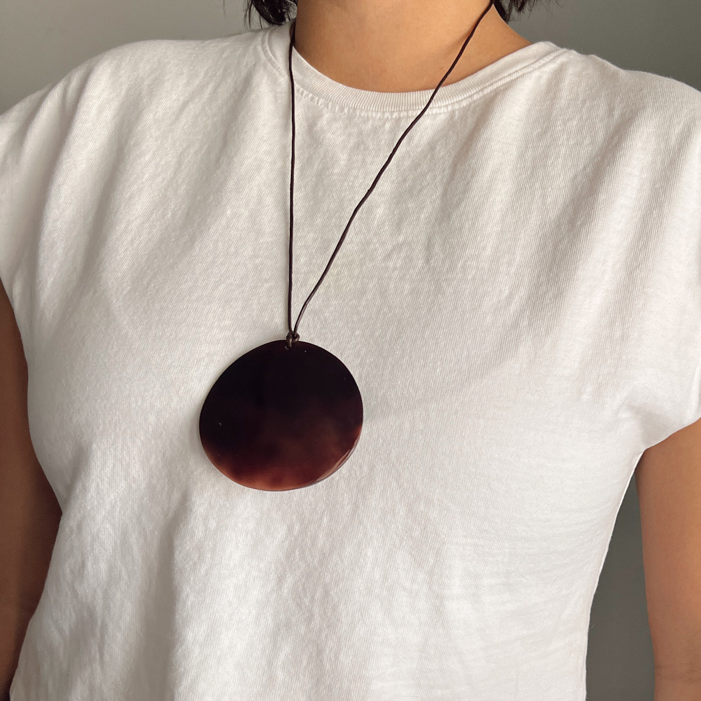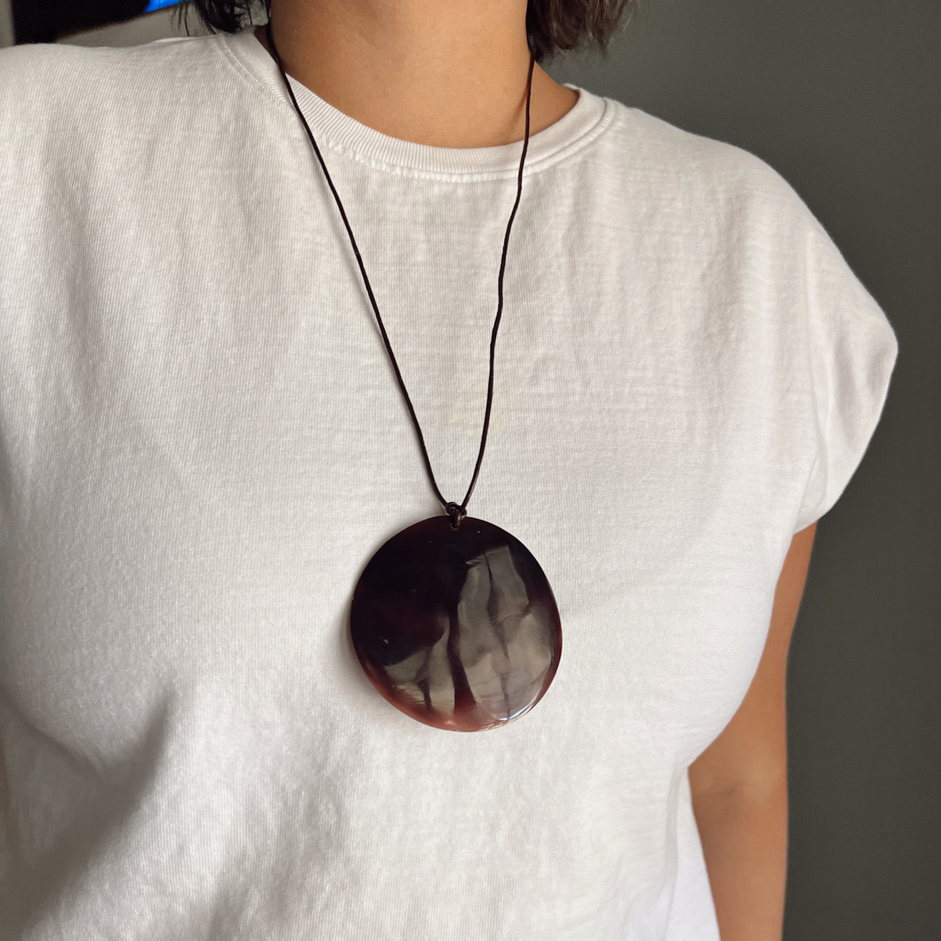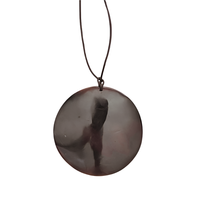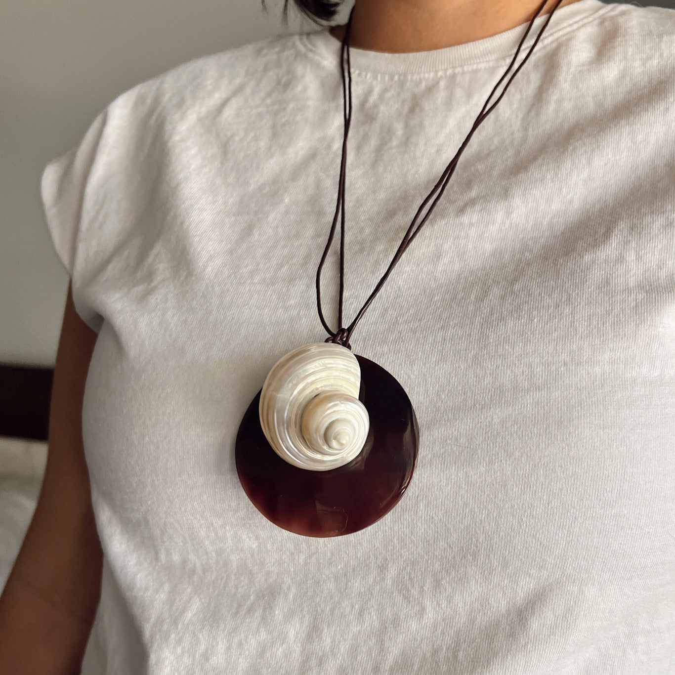 The Mana necklace features a rich brown shell pendant on an adjustable dark brown leatherette cord, finished with silver accents. Symbolizing strength and balance, it can be worn alone or layered for a refined look.