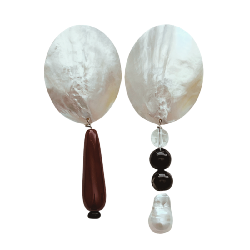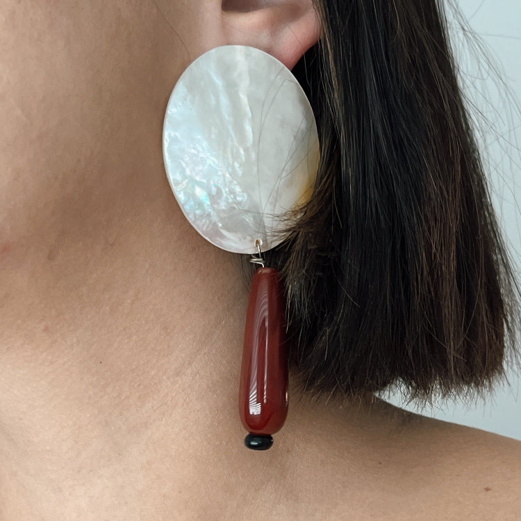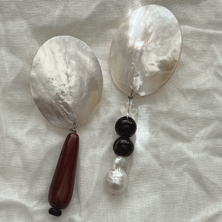 Discover the allure of Nohea earrings. With milky white mother of pearl, black onyx beads, and a maroon teardrop, these asymmetrical earrings are both handsome and refined.