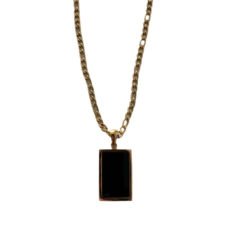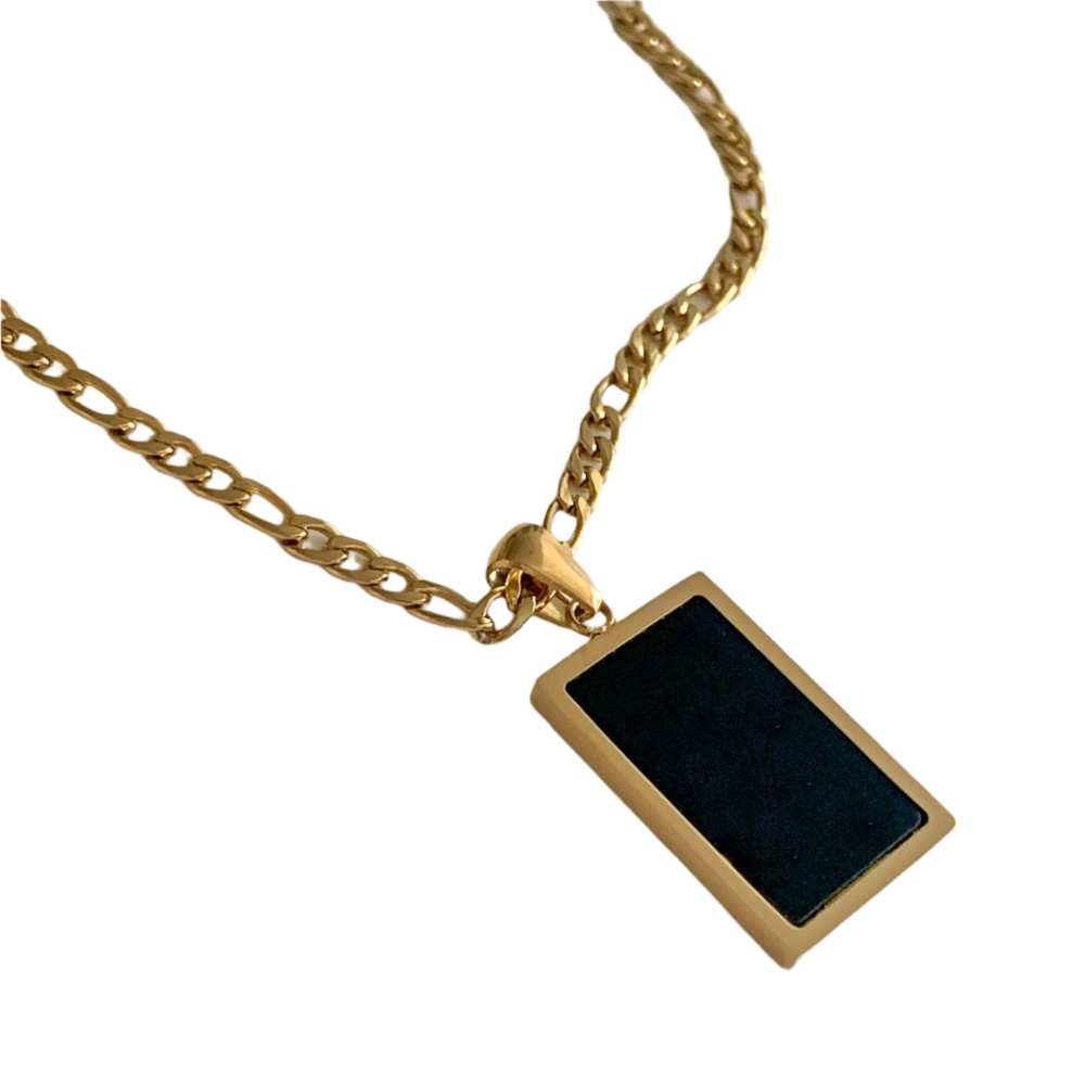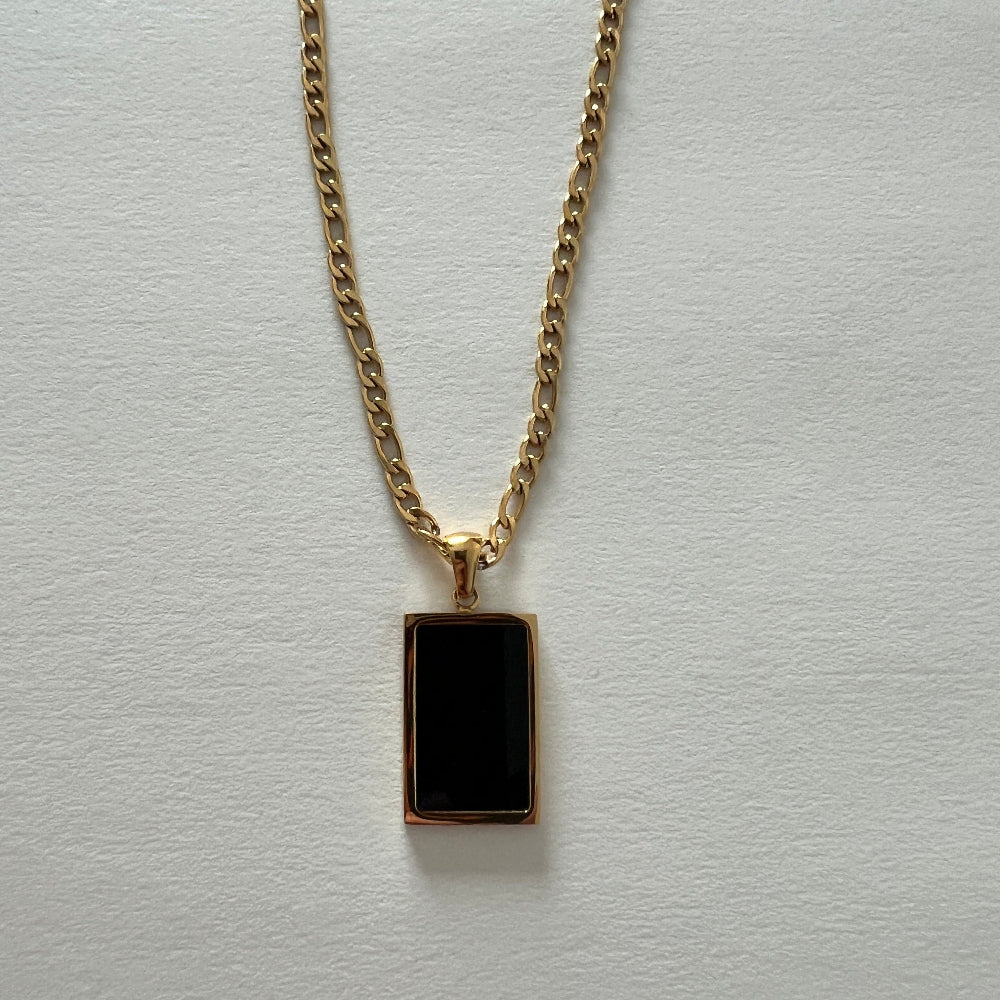 Channel the goddess of night with Nyx. This contemporary and minimal necklace features a 1" black square pendant framed in gold, suspended on a gold link chain. Tarnish-free, this piece exudes luxury. Embrace the darkness and elevate your style with Nyx.