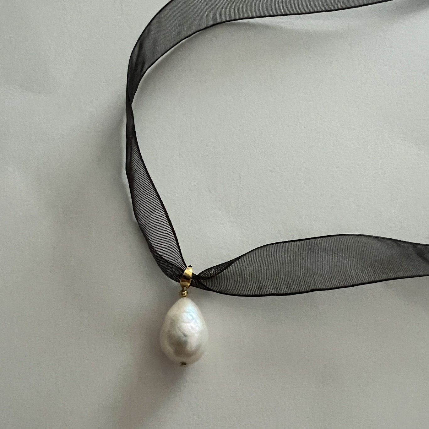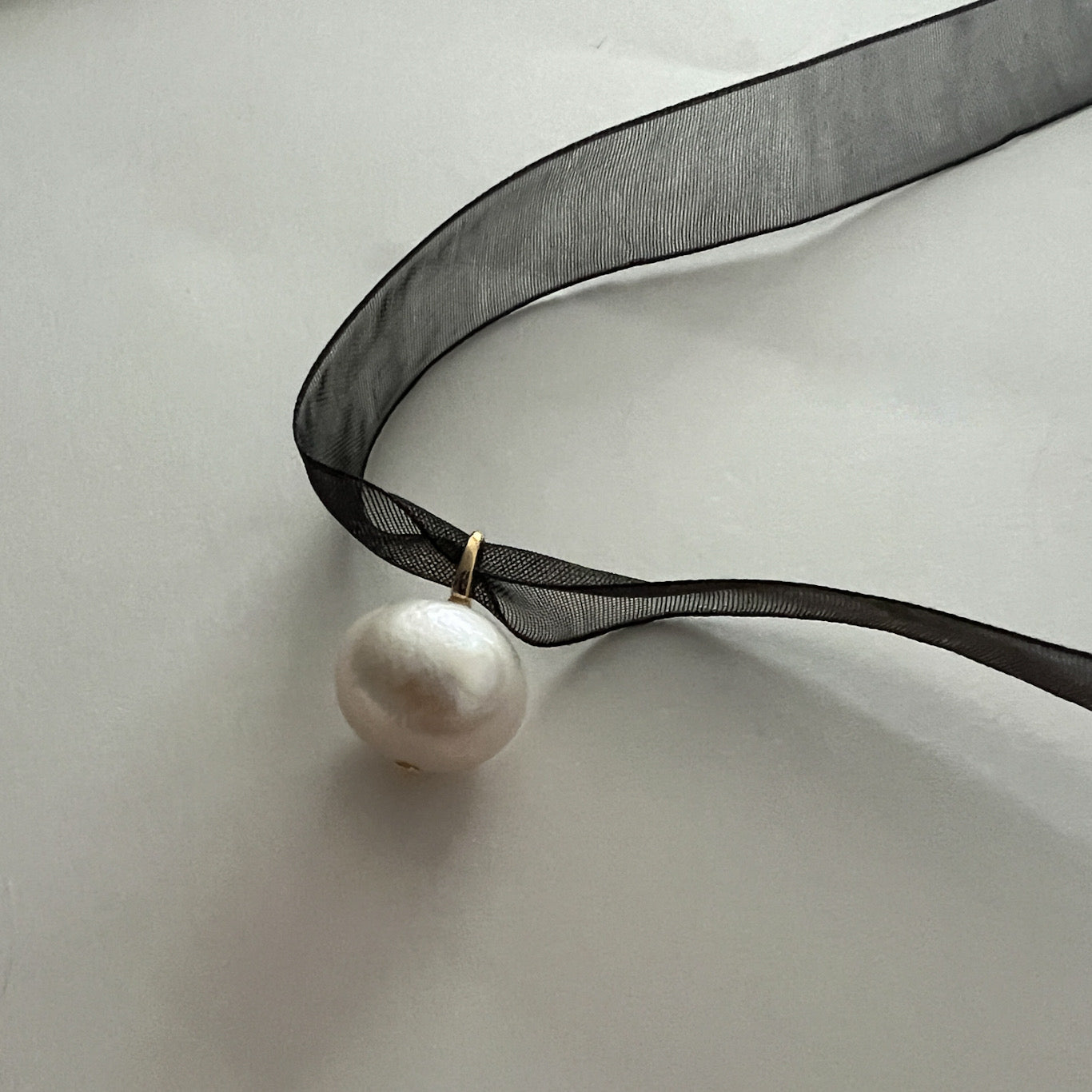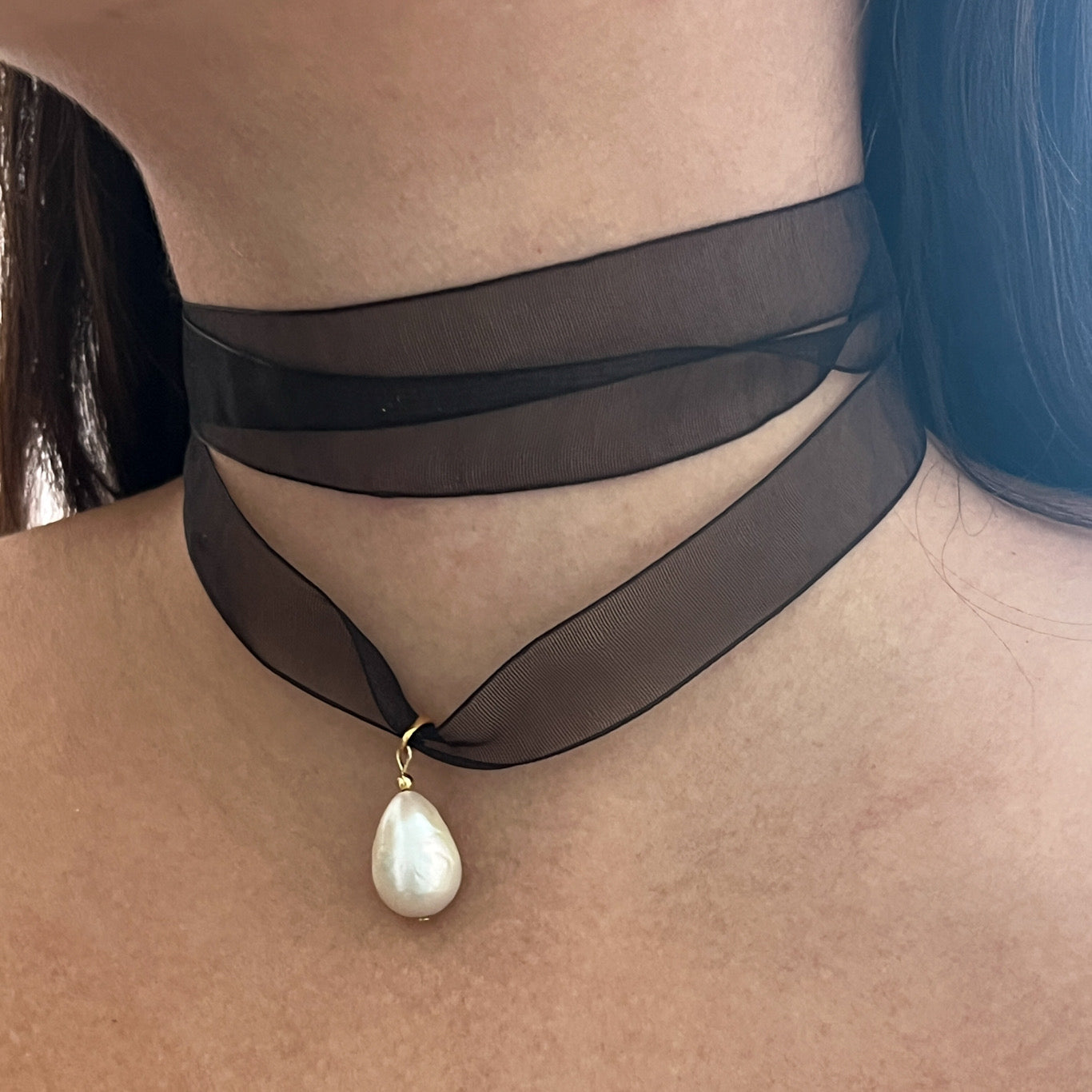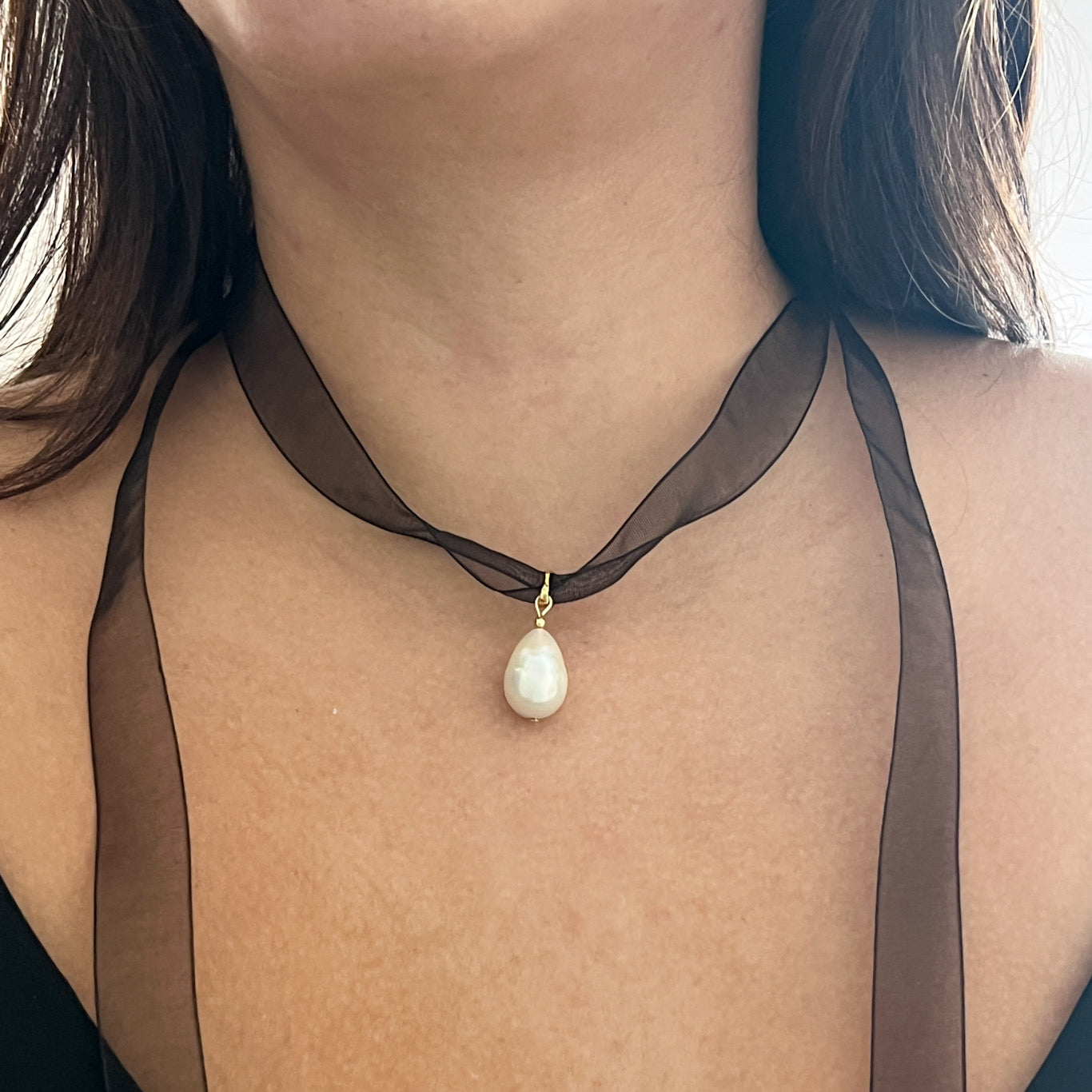 Transform your look with Rue, the sophisticated choker necklace. The adjustable design with a sheer black ribbon and delicate gold detail adds a touch of elegance to any outfit. The freshwater pearl pendant is the perfect finishing touch for a simple yet stunning look. Comes in 2 option sized pearl pendants.