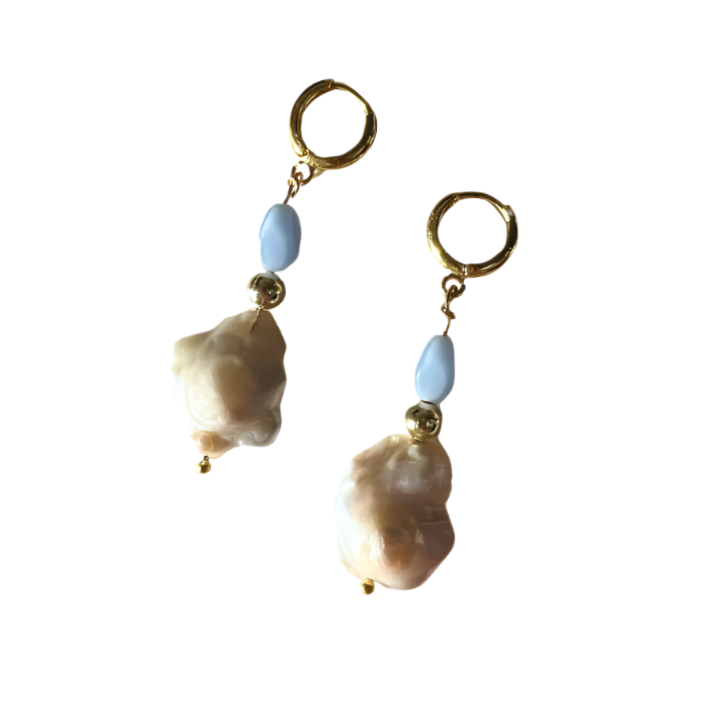 Fun and funky No. 3 drop earrings feature a beautiful freshwater floral pearl and glass beads. Dainty huggie clasps for a gentle approach.